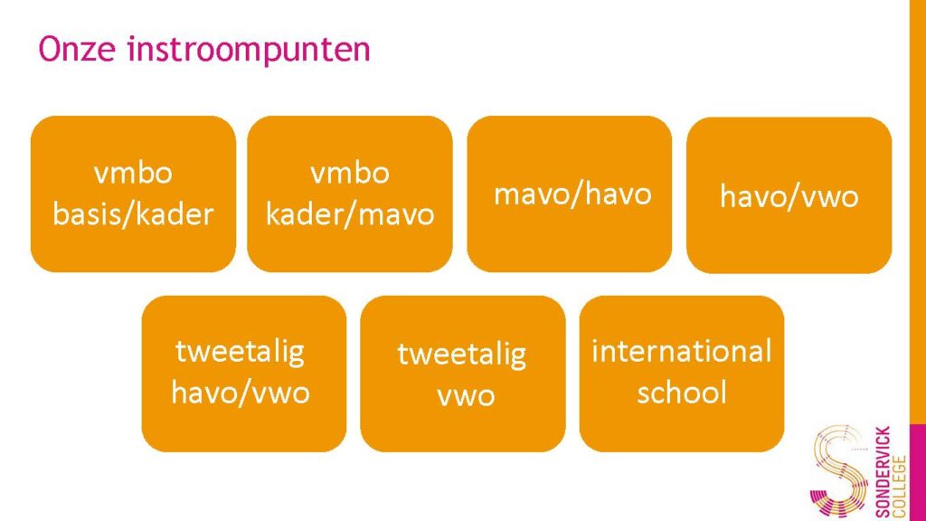 It is important to us that you quickly feel at home at our school and that you are in the right place. At our school, all bridge classes are two-year classes. This gives you ample time to get used to secondary education. There is a vmbo basis/kader bridge class, a mavo/havo bridge class and a havo/vwo bridge class. In these so-called roof-top classes, classes are taught at both levels. Do you need some extra explanation? Then you will get it. Just ready for some extra challenge? Then the teacher will provide in-depth material. During testing we take your level into account. In the second year at the Sondervick College we look, together with you and your parents, at which study program suits you best.