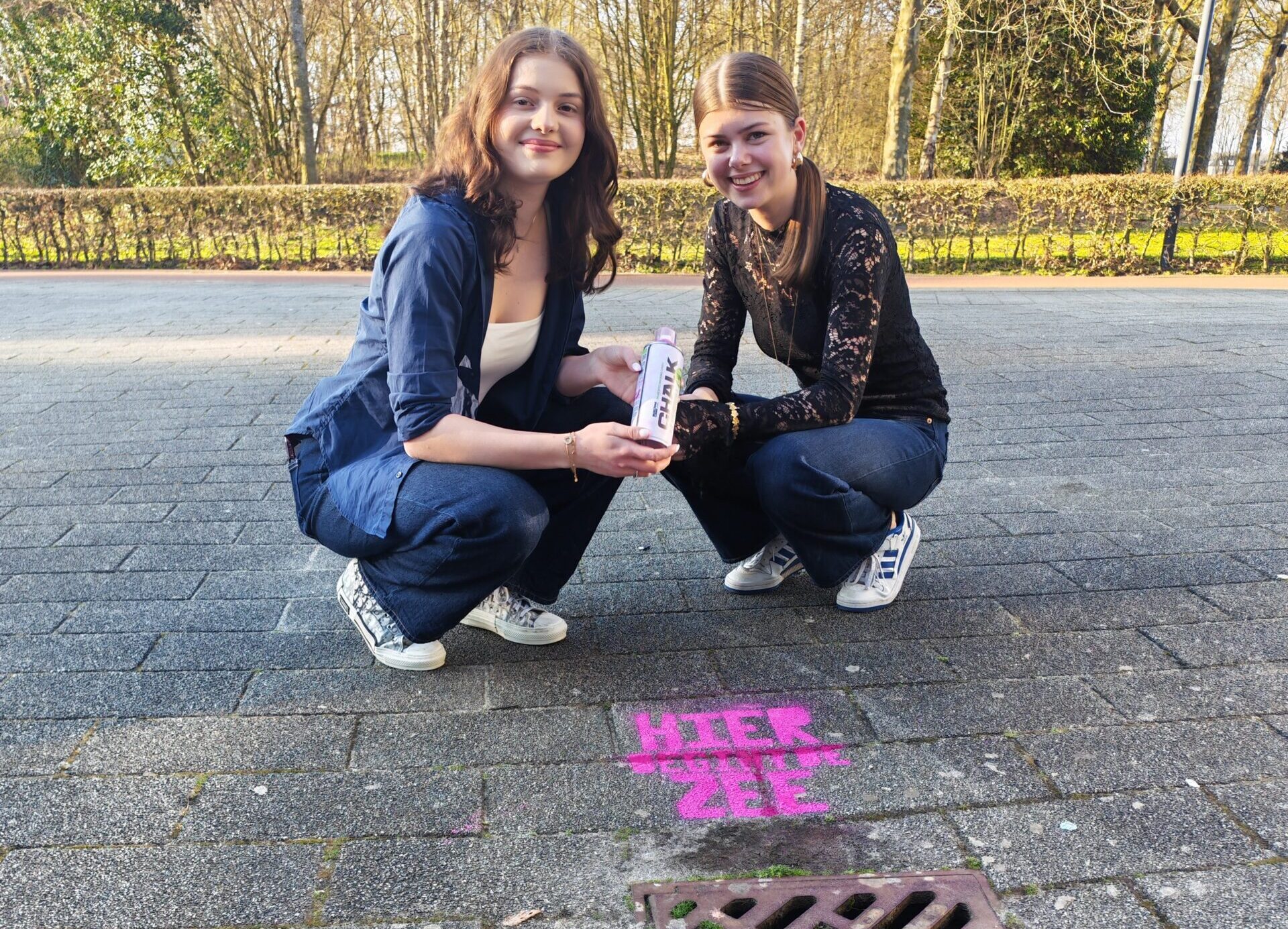 Waarschijnlijk hebben veel leerlingen en collega’s het de afgelopen dagen wel gezien: op verschillende plekken op onze campus verschenen opvallende roze teksten rondom straatputten. Leerlingen bleven staan kijken. Docenten vroegen zich af wat er aan de hand was. De actie is onderdeel van het profielwerkstuk van Ilse Vloet en Rosa van Loon uit 5 havo.